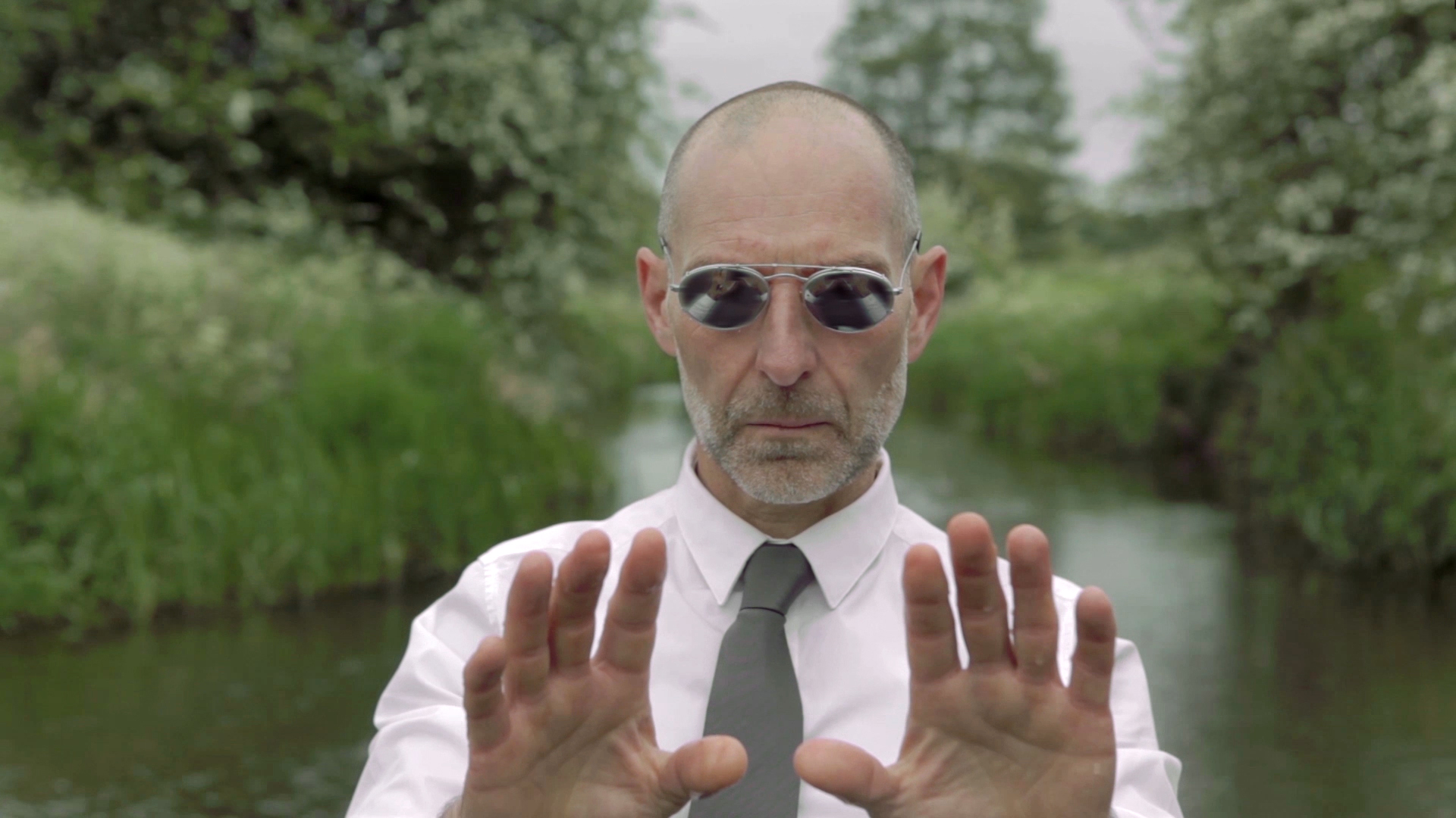 Elsewhere responds to the promise of virtual reality to experience new worlds as new characters in new bodies. The work imagines a fall from one reality into another, and a transition between physical and virtual senses of presence. A man stumbles and wades alone through a country stream. He appears out of place, his grey city clothes in contrast with the surrounding green landscape. On his face rest a pair of glasses with a lens conspicuously missing. He ignores the world around him, absorbed in the search for a means to escape it—to return to somewhere else and to be someone else.