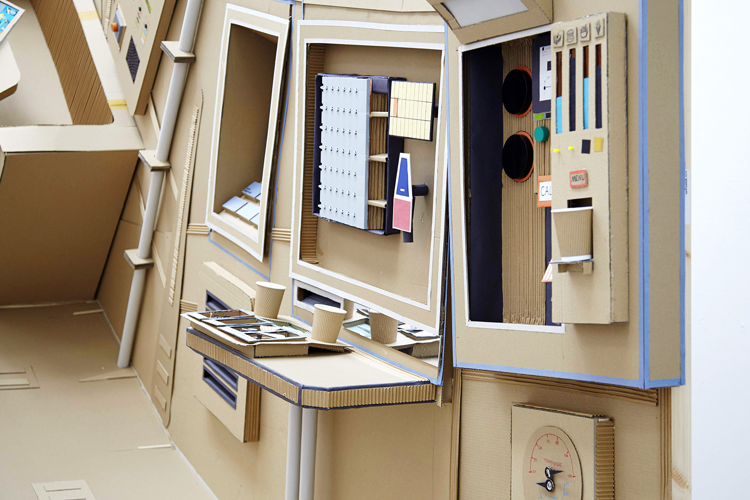 The installation build was a four day event during the festival. Through conceptual and practical discussions, students were invited to focus on making different areas of the set and develop their methods of prototyping ideas at 1:1 scale. Made primarily with cardboard, the installation offered a new tactility to Kubrick’s science fiction, responding to the fascinating material held in the Archive.